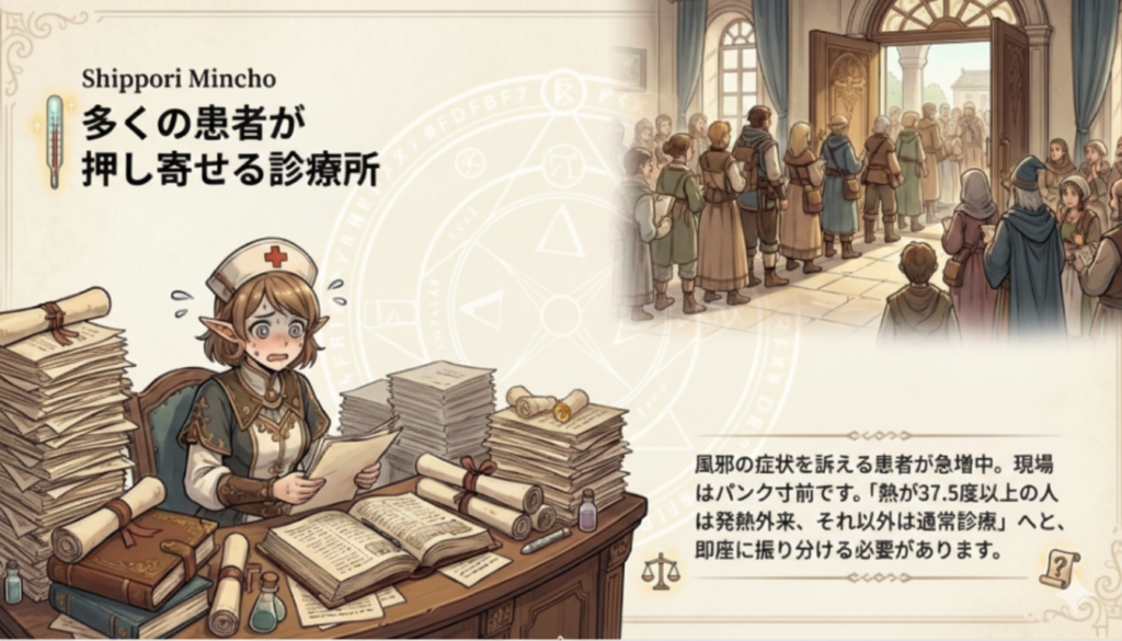 舞台は、診療所。発熱のあるなしで、IF関数さんが活躍している様子をのぞいてみましょう。