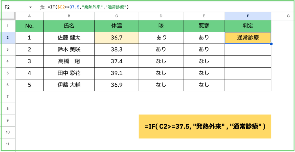 今回F2に入力した式: =IF( C2>=37.5, “発熱外来“, “通常診療” )