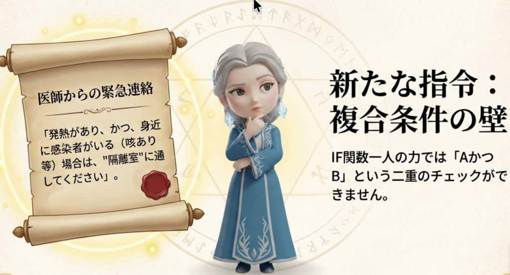 =IF(AND(C2>=37.5,D2=”あり”),”隔離室“,”発熱外来“)