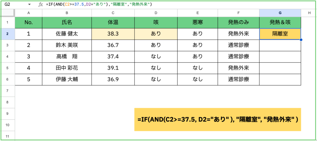 G2に入力された式: =IF(AND(C2>=37.5,D2=”あり”),”隔離室”,”発熱外来”)