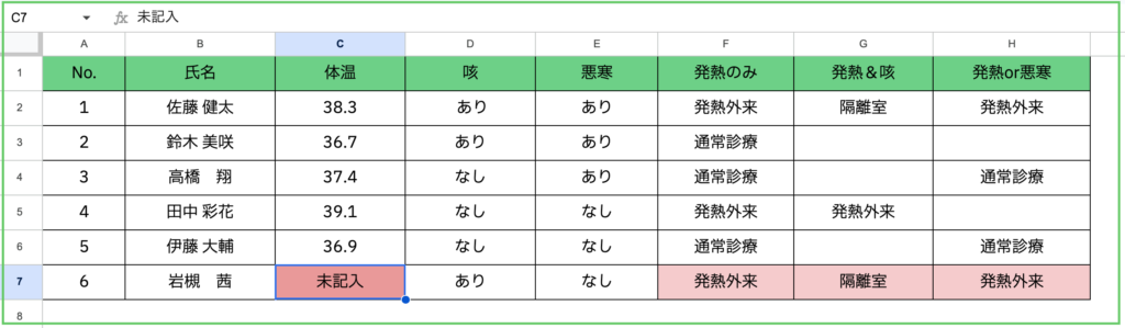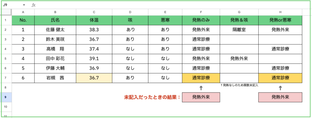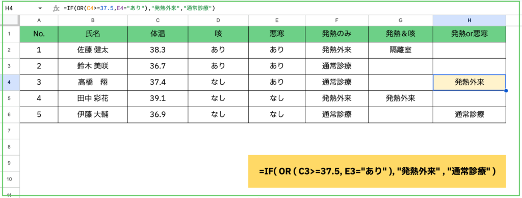 H4に入力された式: =IF(OR(C3>=37.5,E3=”あり”),”発熱外来“,”通常診療“)