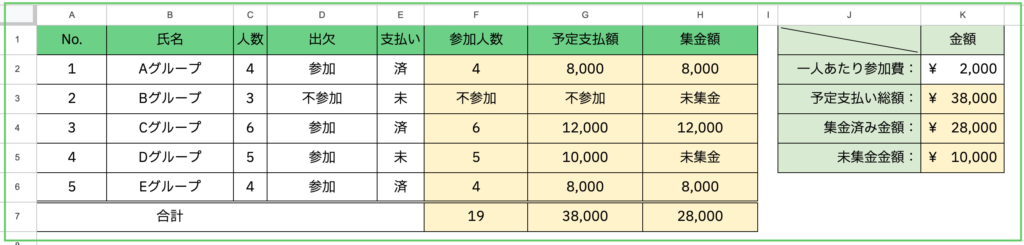 今回は、学生チームがイベントの打ち上げ会をする時の事前とりまとめと、集金を管理した表を使って確認します。